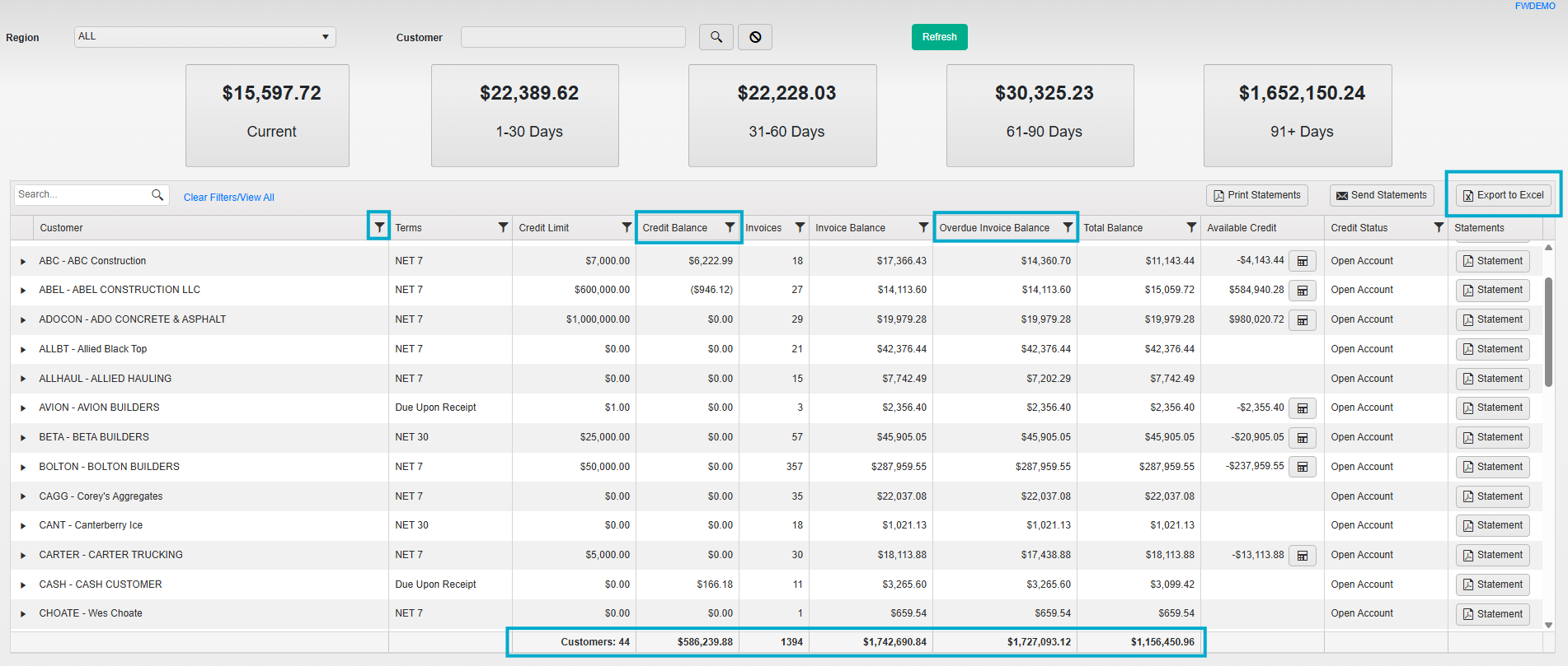 Note: If a customer has no open invoices but has a credit balance, it will display on Aging reports but not on the Balance Dashboard.